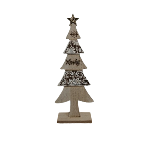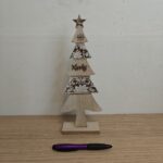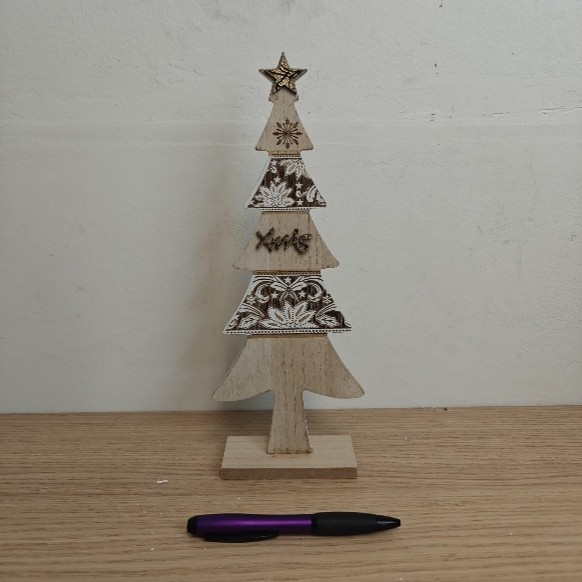 Diese Dekoration eignet sich ideal für den Gebrauch im Haus, eignet sich aber auch sehr gut für Geschäftsumgebungen wie Schaufenster, Theken oder Wartebereiche. Das hölzerne Weihnachtsbaum-Weihnachtsfest kann komplett natürlich für einen minimalistischen Look platziert werden, aber auch mit anderen Winterartikeln wie Lichtschnüren, Kunstschnee oder kleinen Accessoires kombiniert werden, um ein reicheres Ganzes zu schaffen. Aufgrund seines langlebigen Materials und seines zeitlosen Designs ist dies ein dekoratives Objekt, das Jahr für Jahr während der Feiertage wiederverwendet werden kann. Es ist eine stilvolle und praktische Wahl für alle, die kompakte und atmosphärische Weihnachtsdekorationen suchen.