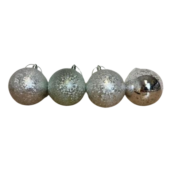 Verleihen Sie Ihrem Weihnachtsbaum mit diesem Set aus vier silbernen Weihnachtskugeln einen eleganten und modernen Look. Diese stilvollen Ornamente kombinieren verschiedene Oberflächen, darunter eine dezente Glitzerschicht und einen markanten Spiegeleffekt. Die Variation in der Textur schafft ein verspieltes und verfeinertes Ganzes, das Ihrer Weihnachtsdekoration sofort mehr Tiefe und Charakter verleiht.